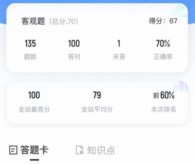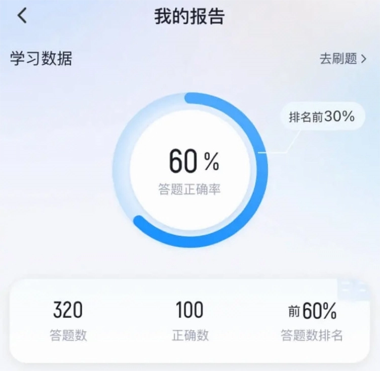 学习报告会将呈现您的答题表现,涵盖各知识模块的得分状况、答题准确率、所用时长等内容。