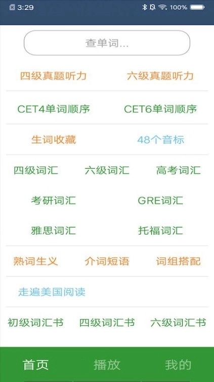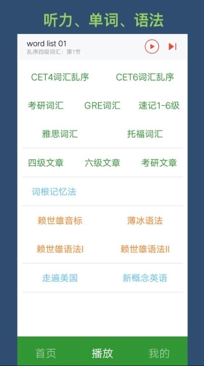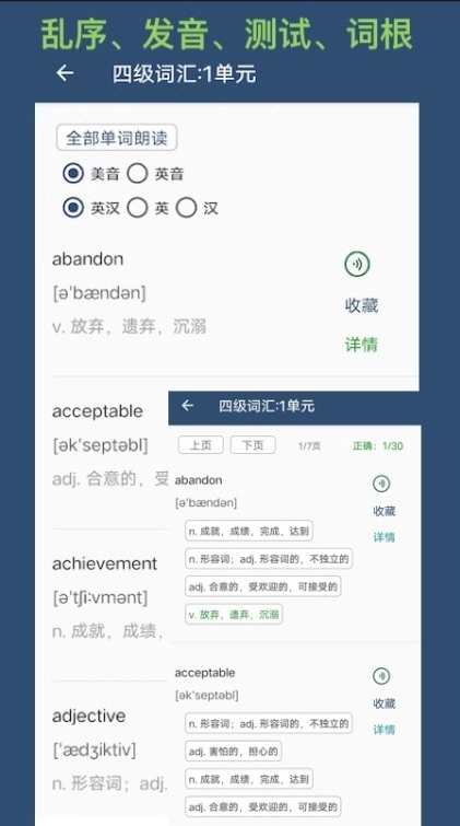 单词批量播放,丰富词根,前缀,支持离线缓存,区间播放,单词测试,单词收藏,单词详情,英音、美音。