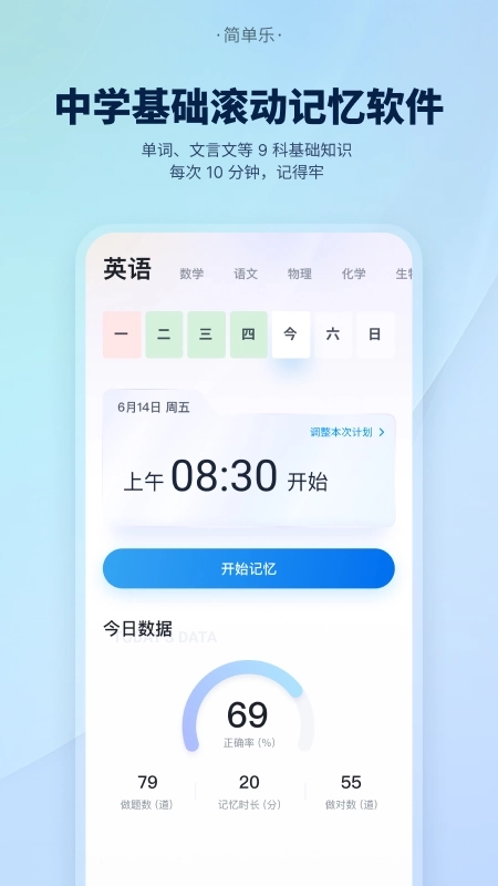 简单乐是一款专业的记忆训练学习软件,涵盖单词、文言文、公式等9科基础知识,支持用户随时开展记忆学习。软件配备专业记忆方法,助力用户高效记住知识点,让学习更轻松。此外,它拥有强大的学习功能,用户可按需选择课程,还提供视频教程、互动练习、在线测试等丰富学习方式,帮助用户更好地掌握知识。