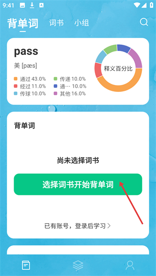 1、进入【背单词】页面后,要是页面上显示【尚未选择词书】,就点击【选择词书开始背单词】按钮,挑选一本适合自己的词书。