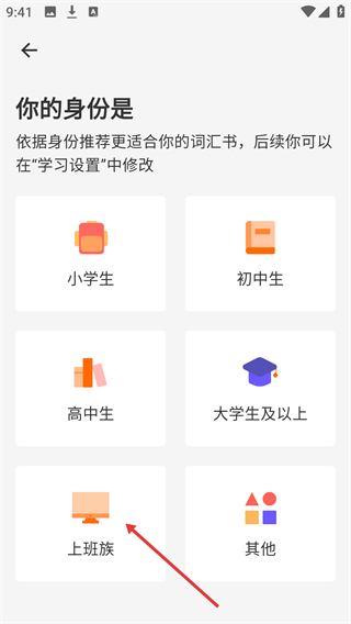2、进入身份选择界面,可选择【小学生】【上班族】等身份类型,系统将依据所选身份推荐与之适配的词汇书。