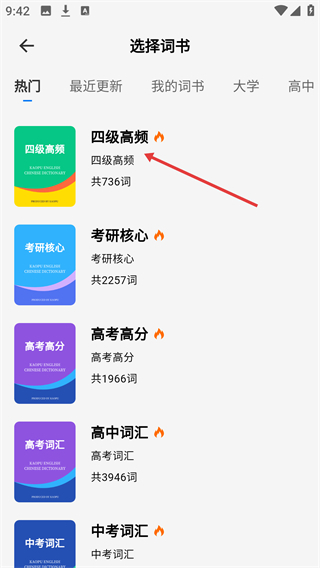 3、进入【选择词书】的【热门】分类页面,这里有【四级高频】、【考研核心】等词书,大家可以根据自己的需求挑选合适的学习词书。