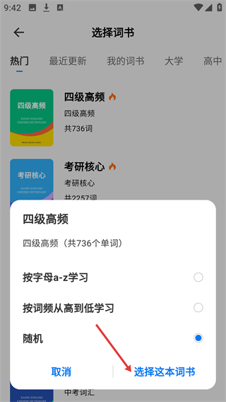 4、当选中【四级高频】词书后,系统会弹出学习方式的选项,在选定具体模式后,点击【选择这本词书】按钮,就能确认使用该词书了。