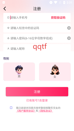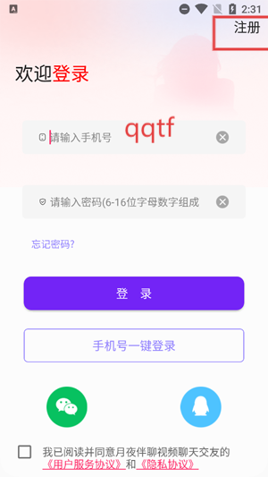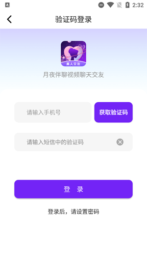 开启你的月夜伴聊视频聊天交友App,轻点进入登录界面。