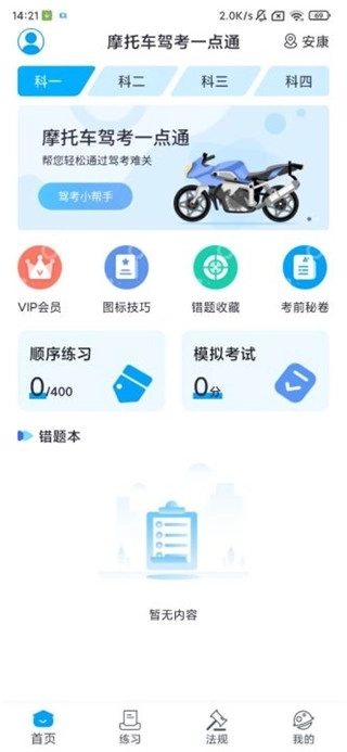 理论学习方面:科目一与科目四的题库涵盖了《道路交通安全法》《摩托车维护常识》等12大章节,并且提供“顺序练习”“随机练习”“错题攻坚”三种练习模式。