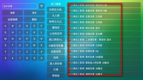 把这些都弄好之后回到应用首页,试着搜索一个视频看看效果,比如输入“边水往事”,马上就跳出好多相关结果,这下又可以开开心心地追剧啦!