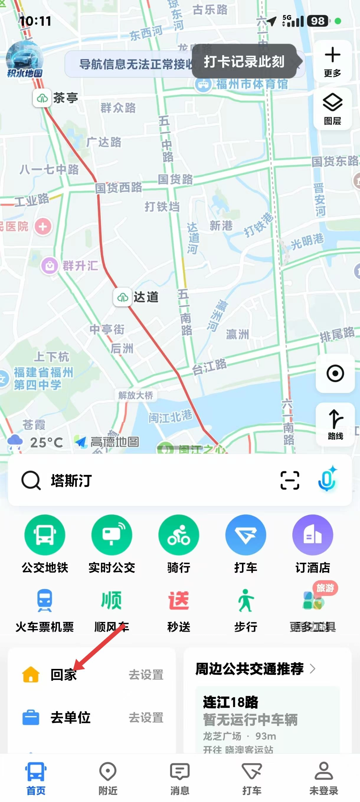 1、首页展示城市地图,配备搜索栏用于查询地点,整合公交、地铁、打车等各类出行工具,设置回家、去单位的快捷功能,并提供周边交通推荐,是综合出行服务的入口。