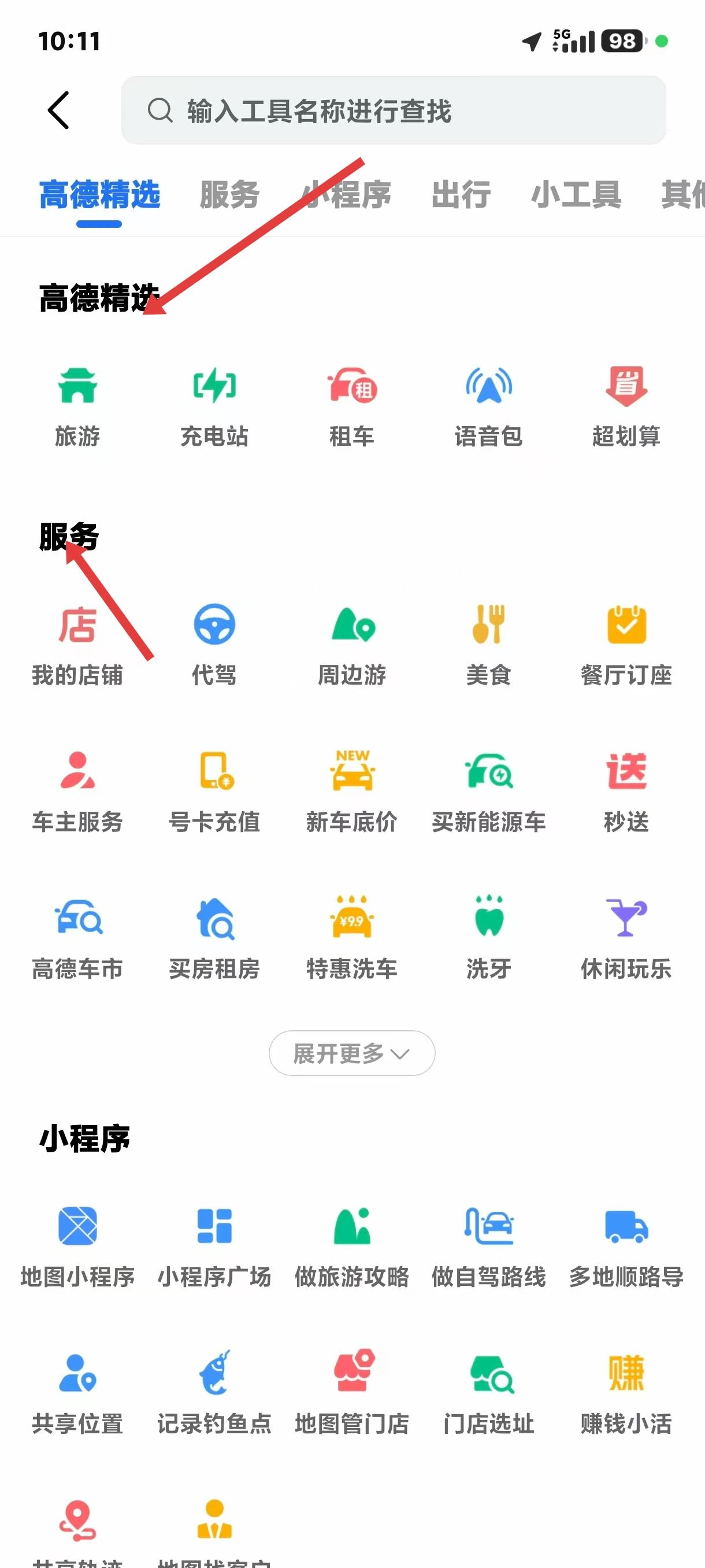 2、工具页分类十分丰富,高德精选里包含旅游、充电站等实用功能,服务模块覆盖了代驾、美食等各类生活场景,小程序还拓展了地图的玩法,能够满足用户的多元需求。