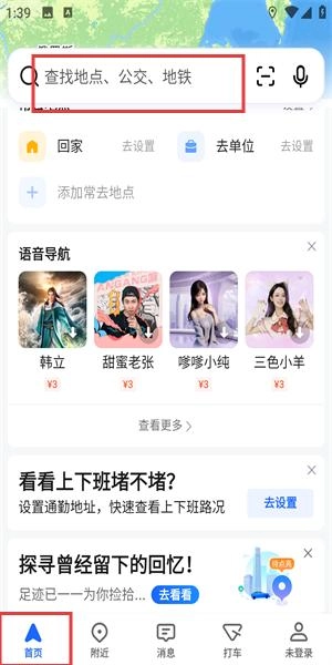 1、启动软件后进入首页,就能借助顶部功能栏中的驾车、公交地铁等选项来规划出行路线。