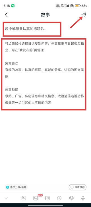 在故事界面,输入【标题】和故事内容,检查确认没有问题后点击发送按钮,即可顺利发布帖子,分享自己的故事啦。