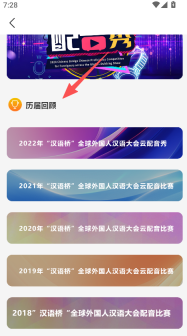 2、具备历届回顾功能,能够查看2018年到2022年多届配音比赛的相关内容,追溯汉语文化交流的历史脉络。
