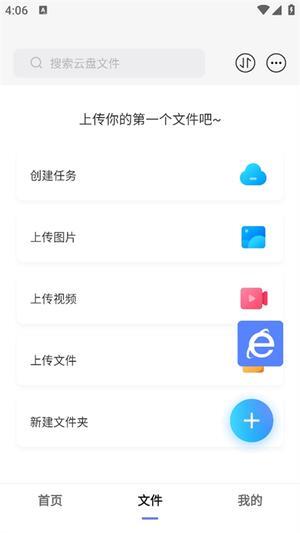 3. 进入文件界面后,便能看到云盘中的各类文件,此界面支持创建任务、上传图片以及上传视频等操作。