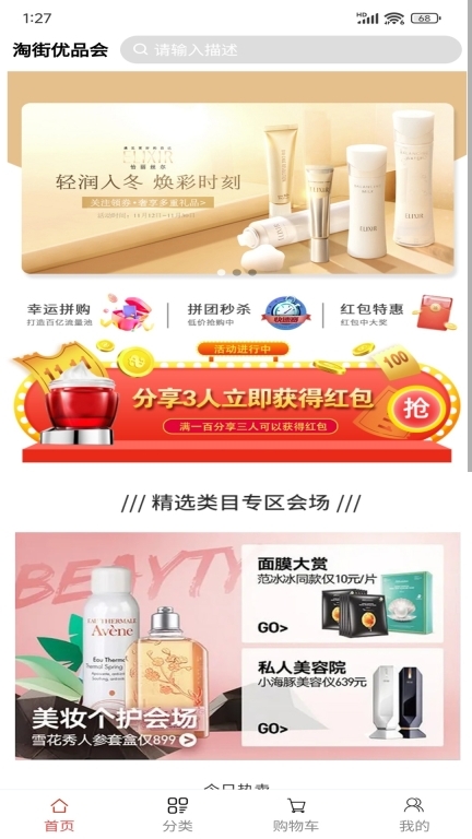 首页设有幸运拼购、拼团秒杀、红包特惠等版块,还能浏览各类精选专场。