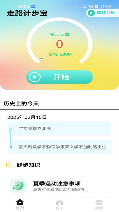 1、屏幕中央是醒目的计步数字,它实时跳动着,能清晰展示用户当前的步行步数,让用户一眼就能知晓自己的运动成果。在计步数字的下方,还设置了今日运动距离、消耗卡路里、运动时长等关键数据板块,全方位呈现用户的运动状况;