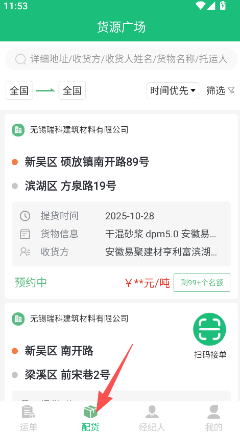 1、进入配货板块的货源广场,查看各类货源信息,掌握提货时间、货物详情以及收货方等相关内容。