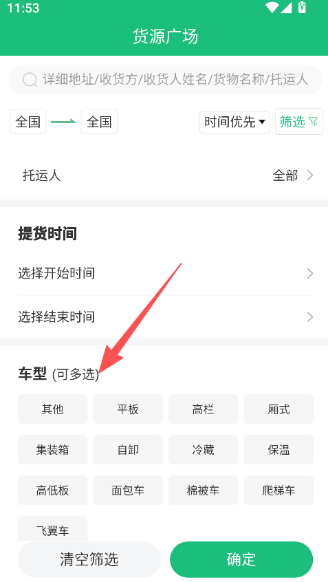 2、利用筛选功能,选定车型、时间等条件,精准查找匹配的货源。