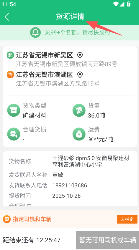3、货源详情板块信息详尽,清晰展示起终点地址、货物类型、货量、运费以及联系人信息。