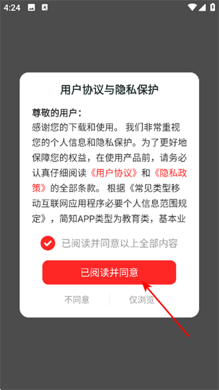 1、在用户协议弹窗中,点击已阅读并同意,进入。