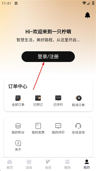 2、进入个人中心页面后,点击登录注册按钮,即可跳转至登录界面。