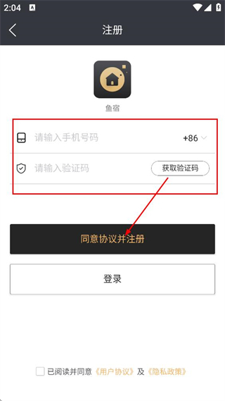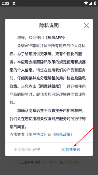 1、勾选“已阅读并同意”后,点击“同意并继续”按钮,即可进入鱼宿的登录页面。