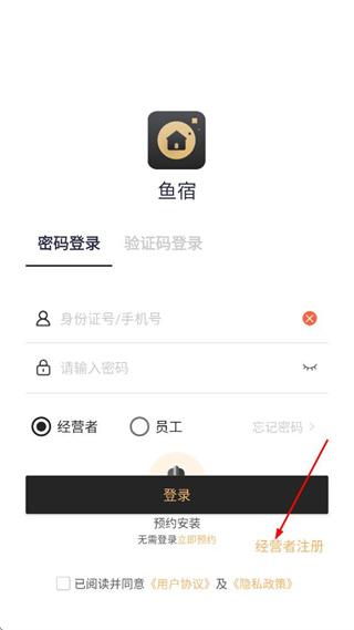 随后我们在鱼宿的登录页面,点击经营者注册选项,进入注册页面。