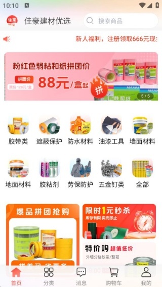 佳豪建材优选是一款专注于销售建筑材料与装修工具等商品的电商软件,商品品类丰富,包括胶带、遮蔽保护用品、油漆工具、防水材料等,能够满足用户在装修、施工等场景下的采购需求。平台不仅提供多样的商品选择,还设有拼团、限时秒杀等优惠活动,为用户带来高性价比的采购体验。