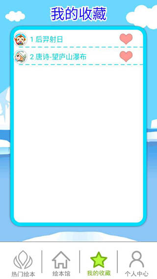 1. 当您观看绘本或者唐诗宋词时,界面右上角会出现一个爱心图标,点击该图标即可收藏成功。