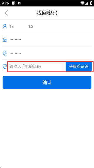 3、输入新密码并再次确认,接着点击【获取验证码】按钮,随后输入收到的手机验证码。