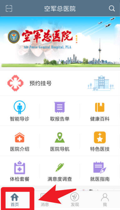 2. 当您进入首页,便能开展预约挂号、查看医院介绍、体检套餐以及健康百科等操作。首页功能完备,常用服务一键即达。