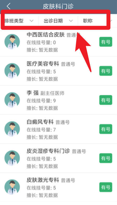 4、挂号时,能够依据排班类型、出诊日期以及医生职称来筛选,以便更便捷地找到合适的科室医生并完成挂号操作。