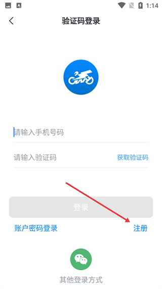 2、在验证码登录页面找到并点击【注册】选项,即可跳转至快速注册页面。