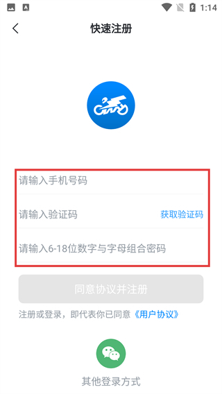 3、在快速注册页面填写手机号码、验证码和密码。