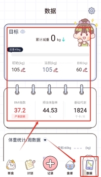 4、数据页面会记录减肥过程中的各项数据,比如体重变化、断食天数等,能直观看到自己的进步,从而更有坚持下去的动力。
