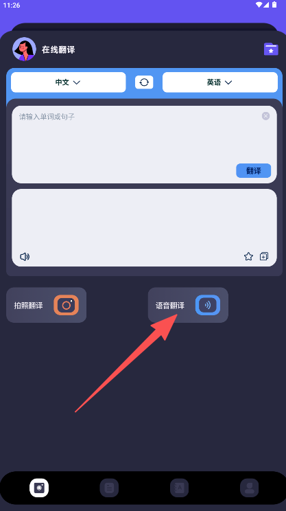 1、在翻译首页点击“语音翻译”按钮,即可进入语音输入界面。