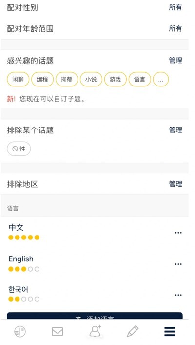 4、在设置中,还能够对配队性别、配队年龄范围进行设定;可以设定自己感兴趣的话题以及不想涉及的踩雷话题;同时也能设置地区和语言。