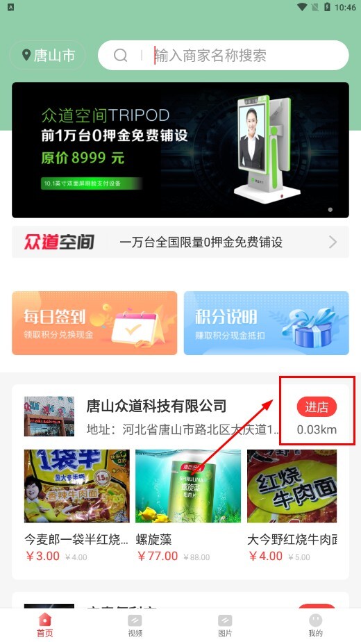 1、在首页找到目标商家后,点击【进店】功能按钮,即可进入该商家的店铺页面。