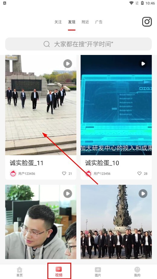 3、点击底部的【视频-功能按钮】,进入视频页面后,挑选自己感兴趣的视频。