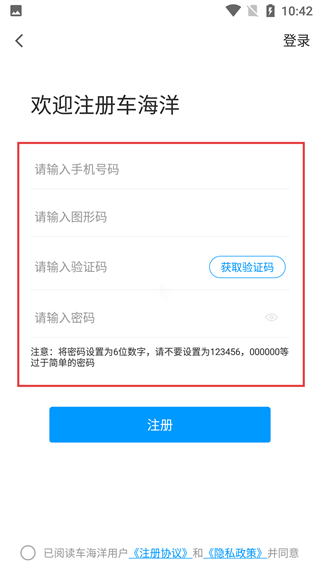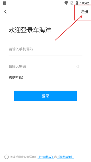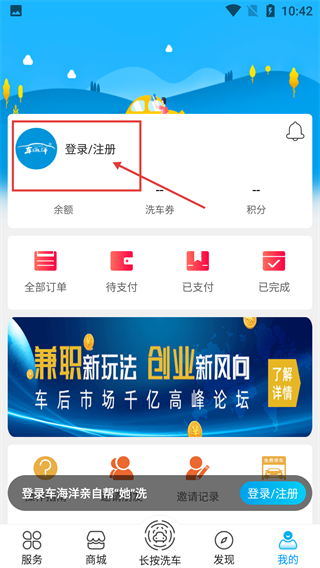 1、在【我的】页面点击【登录/注册】区域,即可进入车海洋登录界面,该界面支持多种登录方式供用户选择操作。