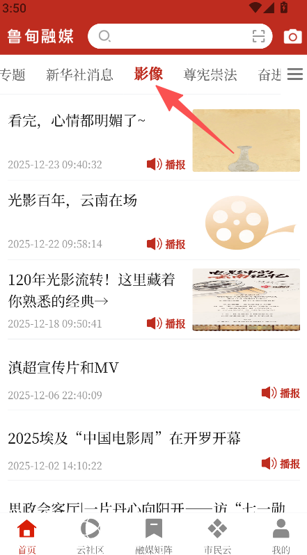3、底部设置首页、云社区、融媒矩阵等板块,功能分区清晰明确,方便用户快速切换至不同功能区域。