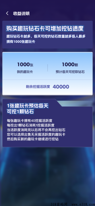 新手将获赠一张新手易卡。只需点击“首页”—“开始挖取钻石”,就能让1钻石到账。每张易卡具备40颗钻石的储量,挖完便结束。当拥有20颗钻石时,可再兑换一张易卡,实现复投。