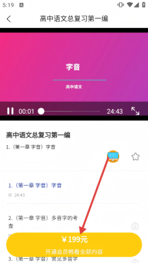 3、进入课程详情页后,点击页面下方标有“¥199元开通会员畅看全部内容”的按钮。
