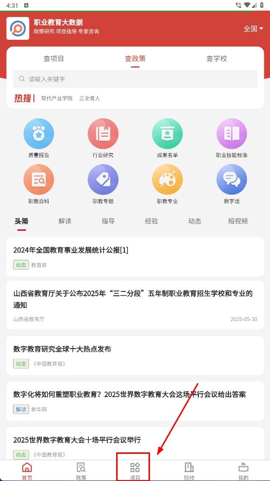 1、在职业教育大数据首页,点击【项目】选项,就能进入项目板块去探索职业教育相关的项目资源。