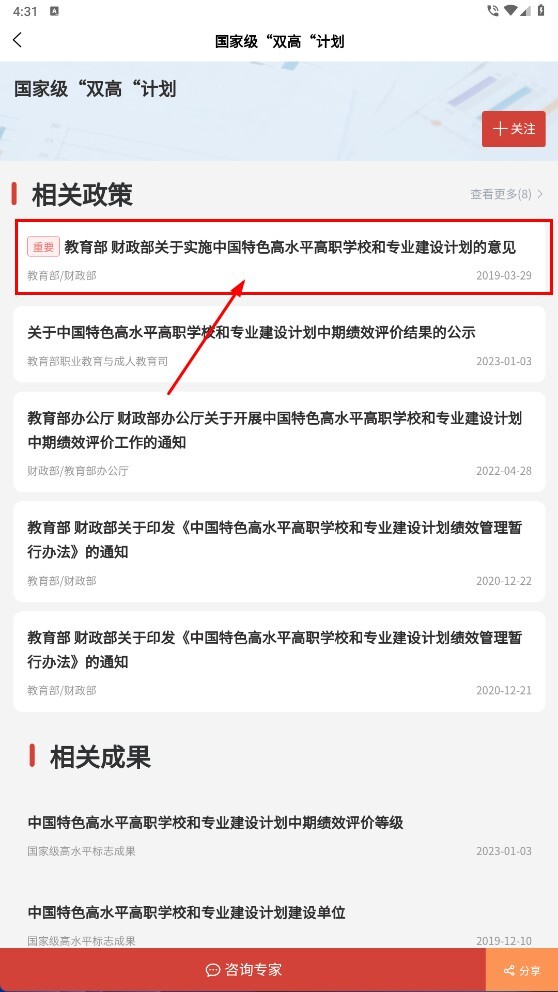 3、进入国家级“双高”计划页面后,点击政策相关条目(例如教育部与财政部联合发布的意见),即可查看该政策的详细内容。