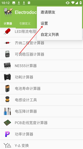 2、在展开的菜单里点击【设置】选项,就能进入应用的设置页面。
