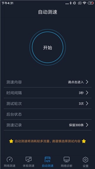 在自动测速功能里,能够选择开展宽带测试、网页测试、视频测试、文件测试等多个项目,后台会提供预计消耗的流量以及所用时间的数据。当使用宽带测速时,预计消耗流量会显示为0;要是使用移动数据,就会显示实际的消耗量。