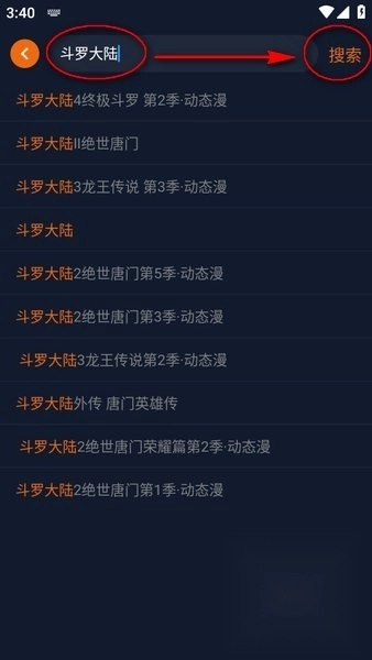2. 以斗罗大陆为例,下拉出现推荐后点击“搜索”;