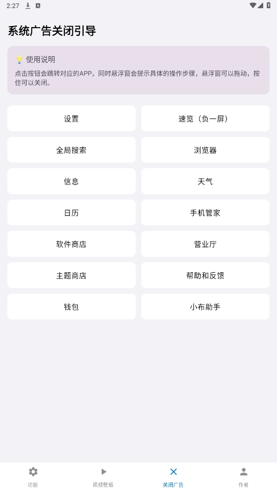 关闭广告的操作步骤如下:首先点击“关闭广告”选项,进入对应的功能界面后,根据自身需求选择合适的工具,然后按照悬浮窗显示的提示进行操作,就能精准拦截各类弹窗广告和推送内容,其中涵盖了系统自带以及第三方软件产生的广告。