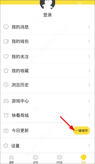 4、进入个人界面后,找到“今日更新”功能选项,点击“一键缓存”按钮,即可完成漫画的缓存操作。