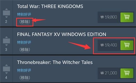 第四步:点击右侧的购物车图标即可进行购买操作,若要将商品移出愿望单,点击左侧的“移除”按钮即可。