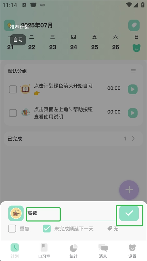 3、在刚刚创建好的计划右侧,点击那个绿色按钮,就能进入自习模式的选择界面。